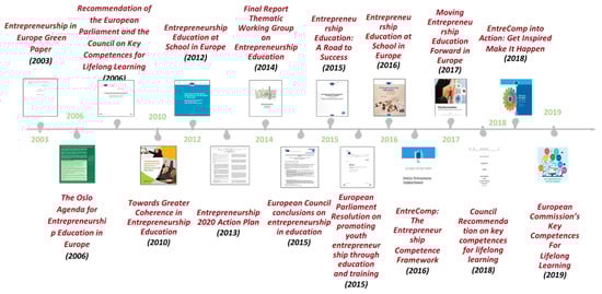 EE’s case is paradigmatic. Judging by the number of recommendations and literature published on entrepreneurship, financial literacy, and the importance of innovation, EE seems a relevant topic for national and supranational institutions. Relevant academic and/or governmental institutions have all demonstrated a positive stance concerning the need to raise awareness for entrepreneurship and the potential benefits of introducing its principles in early life [,,,,]. Yet, EE has, in many countries, failed to enter the policy-making agenda, despite the fact that it has gained attention from employers and policy-makers committed to the entrepreneurship cause []. Figure 1 shows a timeline of documents that were issued concerning EE []: