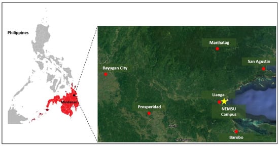 This study covered the residences or locations of the first-year- to fourth-year-level Bachelor in Elementary Education (BEED) and Bachelor in Secondary Education (BSED) of NEMSU—Lianga Campus, Lianga, Surigao del Sur, Philippines (Figure 1). BEED has a total of 392 enrollees, whereas BSED has 292 students. These BEED and BSED students live sporadically across six municipalities and 23 barangays within Surigao del Sur and Agusan del Sur provinces. All students enrolled in BEED and BSED programs were involved in this study.