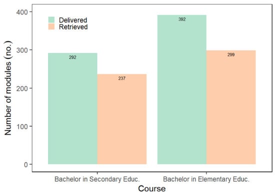 Out of 292 learning modules delivered for BSED students, only 237 or 81% were retrieved (Figure 3), whereas only 299 or 76% BEED students submitted their learning modules out of 392 students enrolled in this program. The BEED retrieval percentage was lower by 5% than the BSED retrieved learning modules, but they are not statistically different (p > 0.05).