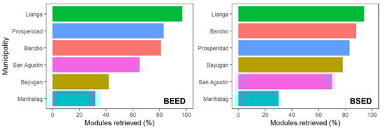 The municipality with the highest retrieved learning modules for the BEED course was Lianga, with 97% module retrieval (126 out of 130 modules; Table 1, Figure 4). However, the least collected modules came from Marihatag, with only 32% module retrievals (8 out of 25 modules). For the BEED students, the municipality of Lianga had the highest recovery of learning materials (94%) after having retrieved 75 out of 80 modules delivered (Table 1, Figure 4). It must be noted that NEMSU’s campus is located in Lianga, thus this high retrieval from this municipality is not surprising. Overall, the average learning module collection per municipality was 67% for BEED and 74% for the BSED students.