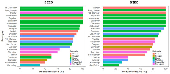 Percent module retrieval per municipality as submitted by Bachelor of Elementary Education (left panel) and Bachelor of Secondary Education (right panel) students of North Eastern Mindanao State University, Philippines.