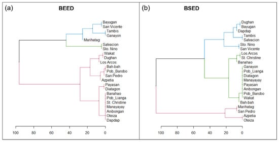 Hierarchical clustering of barangays showing the similarities among the barangays. The similarities were based on the retrievals of learning modules submitted by Bachelor of Elementary Education (a) and Bachelor of Secondary Education (b) students of North Eastern Mindanao State University, Philippines.