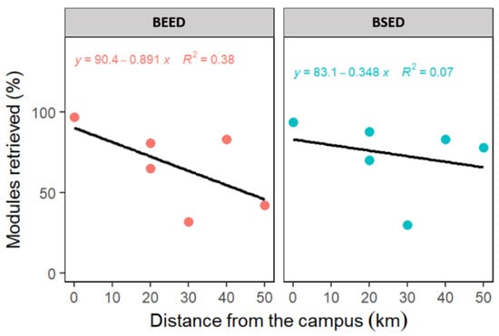 Overall, 68% of the total number of students for both BEED and BSED reside within a <30 km radius, while 32% were within a 30 km–50 km radius. The distance of the students’ residences from the campus mattered mostly for the BEED students (R2 = 0.38), whereas the module submission level by BSED students was less likely to be affected by the distance of their residences to the campus (R2 = 0.07), likely due to the fact that online and other learning resources are also available (Figure 7).