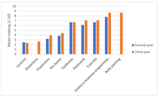 Mean ranking results of what anatomy learning resources students find most helpful. Note: Only the third-year students use dissection and body painting as learning resources in these courses. Lower mean ranking reflected a more helpful resource.