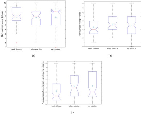 Influence of type of practice before the defense on nervousness (a) before the defense, (b) during the defense, (c) after the defense and before receiving the outcome. n = 202. Box plot with median value (red line) and mean value (blue dot).