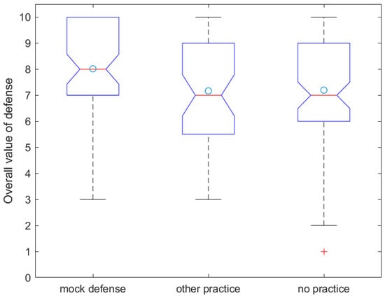Those who had a mock defense rate the overall value of the defense higher (average = 8.01 on a 0–10 scale of overall value of the defense) than those who had a different form of practice (average = 7.17) or no practice (average = 7.20) (p = 0.051). Figure 2 illustrates this observation.