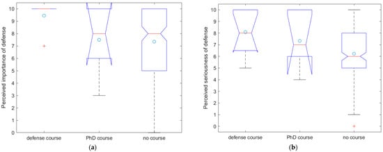Those who took a preparatory course for the defense perceived the defense as more serious (mean = 8.09 for those who took a course about the defense, and mean = 7.33 for those who took it as part of a general PhD course) than those who did not (mean = 6.23), and this relationship is significant (p = 0.0343). This observation is also reflected by the boxplot in Figure 3b. Those who took a preparatory course are thus better aware of the seriousness of the defense, and perhaps less likely to let down their intellectual guard.