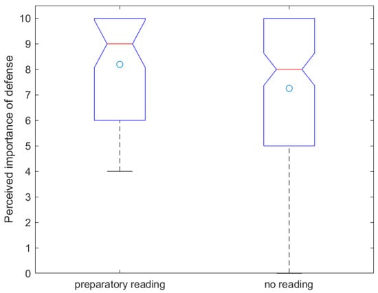 When it comes to the perceived importance of the defense, we can find that there is a weak correlation (p = 0.0727) with preparatory reading. Those who prepared by reading rated the perceived importance of the defense higher (average = 8.20 on 0–10 scale of importance) than those who did not (average = 7.25); see Figure 4. A potential explanation for this observation is that those who read about the defense in preparation understood better the weight and importance of the event.