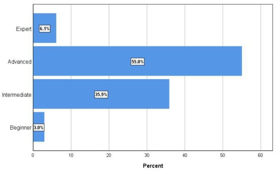 Students were asked to rate their level of familiarity with ICT. Slightly more than half (55.0%) considered themselves to be at the advanced level, while another six percent (6.1%) to be at the expert level. At the same time, around one-third (35.9%) rated themselves to be at an intermediate level. This suggests that a sizeable proportion, while being experienced with technology, felt they lacked relative sophistication. Nonetheless, less than three percent (2.9%) rated themselves as beginners (see Figure 2).
