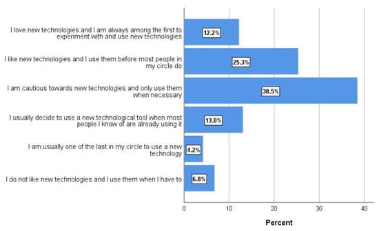 Almost forty percent indicated that they either loved new technologies and were always among the first to experiment with them (12.2%) or that they liked them and tended to use them before most people in their circle did (25.3%). At the same time, around half noted either that they were cautious toward new technologies and only used them when necessary (38.4%) or that they usually decided to use a new tool when most people they knew of were already using it (13.0%). Only a small proportion stated either that they were usually among the last people in their circle to use new technologies (4.2%) or that they did not like new technologies and used them only when necessary (6.8%).