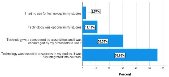 Figure 4 illustrates responses to a question inquiring students about the extent to which technology was embedded in their studies before the pandemic. We can see that most of the students indicated that technology was utilized in their courses. More than half (55.9%) responded that it was considered essential to success in all of their courses and was fully integrated into teaching and learning, while an additional 30 percent that technology was considered a useful tool by the majority of their instructors, who urged them to use it. Still, there were several students in our sample (11.3%, n = 130) who noted that technology was optional in most of their classes and a handful (3.0%, n = 32) who stated that technology was not used at all in their studies.