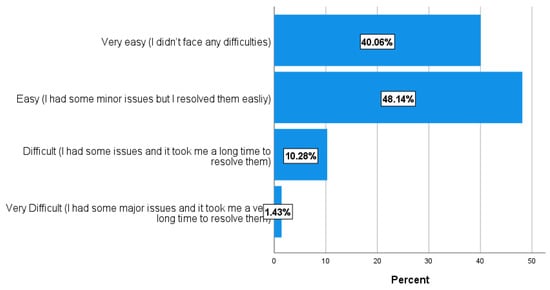 As already noted, most of the higher education students in our study did not face difficulties in their transition to emergency remote learning. For example, the vast majority (88.2%) found the platform employed in their online courses to be very easy or easy to use. Still, a considerable number of students (n = 123; 11.7%) reported having encountered some issues or major issues that took them a long/very long time to resolve (see Figure 8).