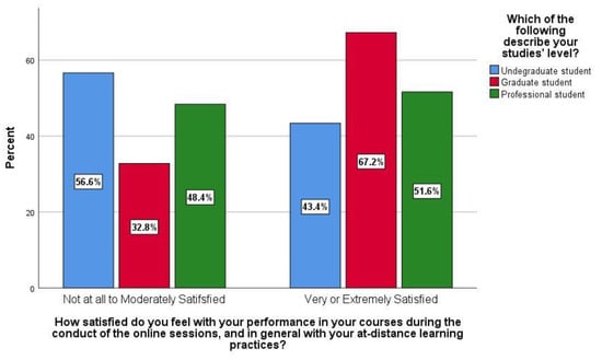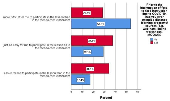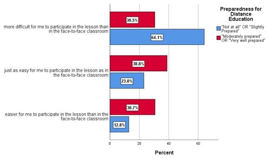 Significant differences in how easy it was for students to participate in the lesson during synchronous online sessions were observed based on level of study (χ2(6) = 36.93, p < 0.001), prior experience with distance learning (χ2(2) = 68.186, p < 0.001) and self-rated preparedness for distance education (χ2(2) = 231.062, p < 0.001). A higher proportion of undergraduate students, students with no prior experience in distance learning and/or students who had indicated their level of preparedness for at-distance education as low (“not at all” or “slightly prepared”) found it more difficult to participate during the synchronous online sessions than in the face-to-face classroom (see Figure 9, Figure 10 and Figure 11).