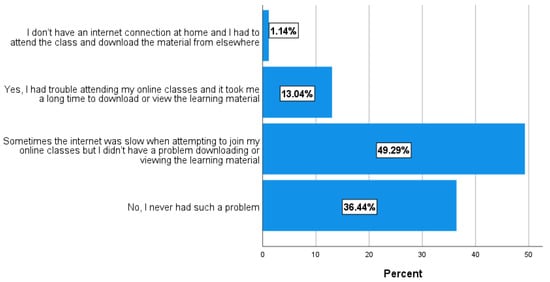 Only one-third of the participants (36.4%) agreed that they never encountered any issue related to internet connection. Half of the participants (49.3%) agreed that “sometimes the internet was slow when attempting to join [their] online classes but that [they] did not have a problem downloading or viewing the learning material.” Another 13 percent agreed that they not only had trouble attending their online class but that it also took them a long time to download or view the learning material. It is also interesting to see that there were 12 students (1.1%) with no internet connection at home who had to attend the class and download the material from elsewhere.