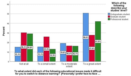 To provide answers to the research questions, quantitative data obtained from the survey’s closed questions were analyzed using descriptive and inferential statistics (the SPPS 24 package was used). Analysis of the qualitative data obtained from the open-ended questions followed a qualitative thematic analysis approach [71,72], during which data were coded and clustered as themes. The combination of quantitative and qualitative data provided complementary information and a more holistic picture of students’ experiences and perceptions regarding the transition from face-to-face to emergency remote learning.