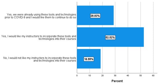 The level of technology integration varied based on the students’ area of study. While in all areas of study, the majority of students agreed that technology was considered useful or essential for their studies, percentages varied based on the field of study—ranging from around two-thirds of students majoring in the arts (66.7%) or mathematics and statistics (68.0%) to 100 percent in journalism. It is interesting to see that a considerable number of students (n = 141, 13.5%) noted that technology was either optional or was not used at all in their studies prior to the pandemic.