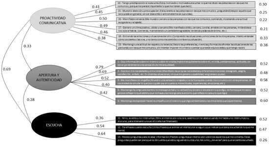 In the confirmatory analysis, there are two items that are not as strong as the rest of the corresponding factors, but we consider that they show acceptable probabilistic values from the psychometric point of view and complement the construct. Thus, one of the items is related to the more external aspects of listening, while the rest of them relate to the internal or active listening aspects (paraphrasing or questioning) and have greater values. With the data, we consider that these three factors can define emotional communication, focusing on the most conative and strategic aspects such as the attitude of wanting to communicate (communicative proactivity), being an open and authentic person and listening emotionally.