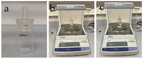 Pycnometer (a) and procedure used to record its weight when empty (b) and full (c).