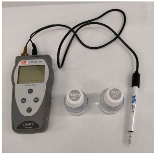 The solutions were characterized in terms of their conductivity using a portable CON 6/TDS conductivity meter (Thermo Fisher Eutech Instruments Pte Ltd., Singapore), shown in Figure 3. Electrical conductivity meters measure the capacity of ions in an aqueous solution to carry electrical current.