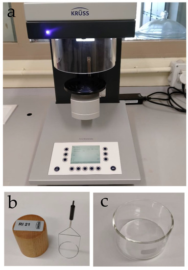 A K20 force tensiometer (Krüss Scientific, Hamburg, Germany) was used to determine surface tension of the solutions. This is a semi-automatic instrument for measuring the surface and interfacial tension according to the ring, plate, and ring tear-off method, which is based on the force that acts when a measuring probe is wetted. This measurement was carried out using the RI 21 platinum-iridium alloy wire ring and SV20 vessel employing the Du Noüy ring method, as shown in Figure 4.