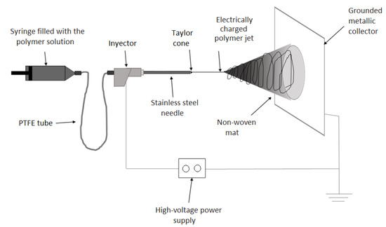 The zein solutions were processed by EHDP using a dual polarization Fluidnatek LE-10 lab tool manufactured by Bioinicia S.L. (Valencia, Spain). The equipment was operated with a single needle injector, horizontally placed toward a fixed metallic collector at room conditions, that is, 25 °C and 40% relative humidity (RH). All of the solutions were processed in the following conditions: 12 kV of voltage, 0.25 mL/h of flow-rate, and 15 cm of tip-to-collector distance. Furthermore, in order to study the influence of the processing conditions, the solution containing 33 wt% zein (solution D) was also processed at 5 kV and 25 kV, 0.1 mL/h and 0.5 mL/h, and 9 cm and 22 cm, fixing the other conditions. Figure 5 shows an illustration of the EHDP device, showing indications of all the different components.