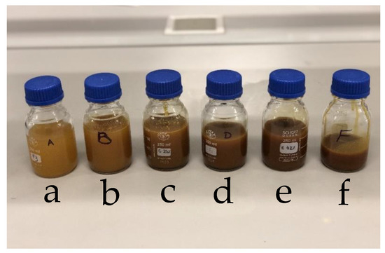 Prepared solutions with different contents of zein, from left to right: 5 wt% (solution A, (a)); 12 wt% (solution B, (b)); 25 wt% (solution C, (c)); 33 wt% (solution D, (d)); 42 wt% (solution E, (e)); 50 wt% (solution F, (f)).