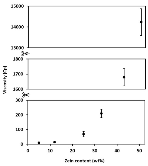 Finally, Figure 10 shows the variation of solution viscosity with different zein contents. As can be observed, in all cases, solution viscosity increased exponentially with increasing zein content. It is well-known that both polymer concentration and polymer’s MW greatly influence the solution viscosity, and the latter property is paramount for optimizing EHDP. In this regard, fiber-based morphologies can only be stabilized using solutions in medium and medium-to-high viscosity ranges. On the contrary, below a critical process viscosity, EHDP results in beads or beaded fibers, whereas the process is impaired when the solution is too viscous due to clogging issues [18]. For instance, values of viscosity > 100 mPa·s are needed to obtain bead-free and uniform fibers of zein [19]. As a result, students should pay particular attention to preparing polymer solutions with the right viscosity by choosing the adequate polymer, when possible, and the right concentration to avoid encountering processability issues and also to attain the desired morphology during EHDP.