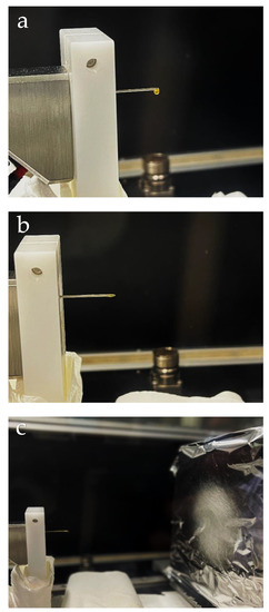 The second session was devoted to processing the previously prepared zein solutions using EHDP. This task was performed by the supervisor who had previous experience in EHDP, but all phenomena was observed and explained to the students. In addition, during this experimental activity, the previously measured properties of each solution were elucidated and related to the different processability aspects during EHDP. At the beginning of the process, for all the zein solutions, the change in the polymer solution from a spherical drop to Taylor’s cone as a result of the applied voltage was observed. This is illustrated in Figure 11 and it was naked-eye observed by students. Thereafter, students could also see the formation of beads or fibers after a few minutes on the collector. The electrosprayed or electrospun zein materials were easily seen as a white coating or mat deposited onto the aluminum foil. At this point, it was important to remark that the zein material changed its color from yellow, in the solution, to white, in mat form. This color change is due to the ultrathin size of the fibers or particles, which increases scattering of visible light.