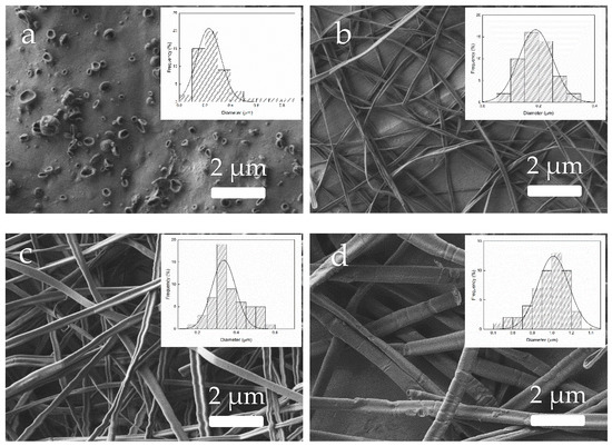 Morphology of the zein materials processed by electrohydrodynamic processing (EHDP) obtained from solutions: (a) 12 wt% (solution B); (b) 25 wt% (solution C); (c) 33 wt% (solution D); (d) 42 wt% (solution E). The processing conditions were fixed at 12 kV, 0.25 mL/h, and 15 cm. Images taken with a magnification of 5000× and scale markers of 2 μm. Insets show particle or fiber diameter distributions.