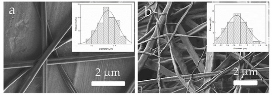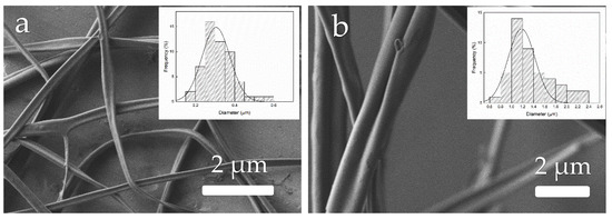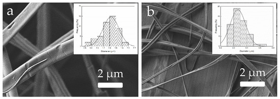 Morphology of the zein materials obtained from solution D processed by electrohydrodynamic processing (EHDP) as a function of the voltage: (a) 5 kV; (b) 25 kV. Images taken with a magnification of 5000× and scale markers of 2 μm. Insets show fiber diameter distributions.