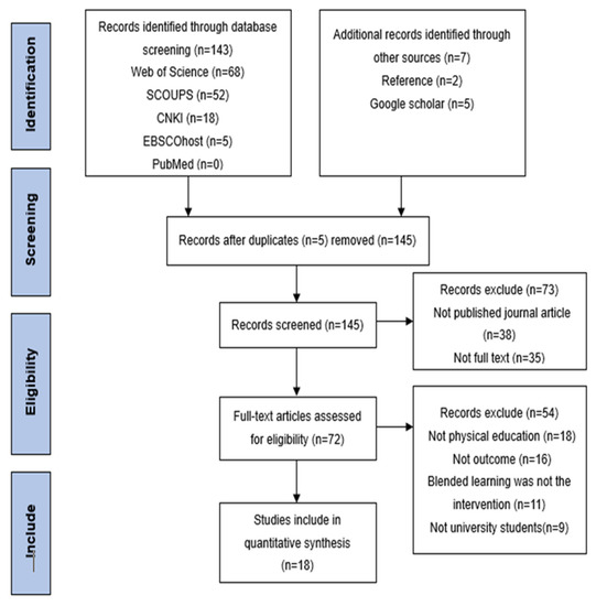 We conducted a systematic search between 1 April and 30 April 2022, allowing us to include all publications on the effects of BL in physical education among university students published before March 2022. The search was carried out in the following five main databases: Web of Science, Scopus, PubMed, EBSCOhost (SPORTDiscus), and China National Knowledge Infrastructure (CNKI), as these databases cover most of the sports-related high-quality articles. In each database, the literature was searched by title, using the predefined combination of the following keywords: (“blended learning” OR “blended course” OR “blended education” OR “B-learning” OR “hybrid learning” OR “hybrid course” OR “hybrid education” OR “flipped learning” OR “flipped classroom” OR “MOOC” OR “MOODLE” OR “learning strategy”) AND (“physical fitness” OR “health-related fitness” OR “fitness element” OR “body composition” OR “flexibility” OR “muscular strength” OR “muscular endurance” OR “cardiorespiratory” OR “balance” OR “learning outcomes” OR “academic performance” OR “learning attitude” OR “attitude” OR “motor skills” OR “physical education” OR “sports” OR “physical activity”) AND (“university students” OR “college students” OR “undergraduates” OR “undergraduate students” OR “higher education”). We also searched Google Scholar and the reference list of the selected studies for additional literature that may not have been included in the search results of the five databases.