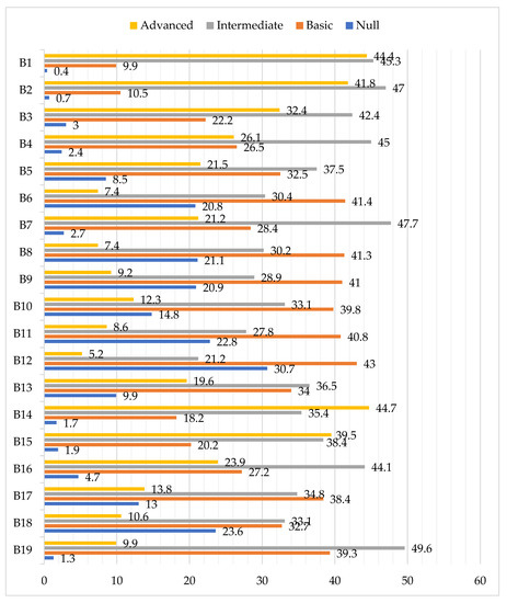 First, we performed a descriptive analysis of the response percentages obtained for each of the dependent variables (B1–B19). These responses were catalogued using the following scale according to their competence levels: null (total absence of knowledge/skill); basic (basic knowledge/skill); intermediate (significant knowledge/skill); advanced (mastery of knowledge/skill) (Figure 1). From this test, we can notice that most future teachers claim to have an advanced level on items B14 and B15. In addition, an intermediate level of competence stands out on items B1, B2, B3, B4, B5, B7, B13, B16 and B19.