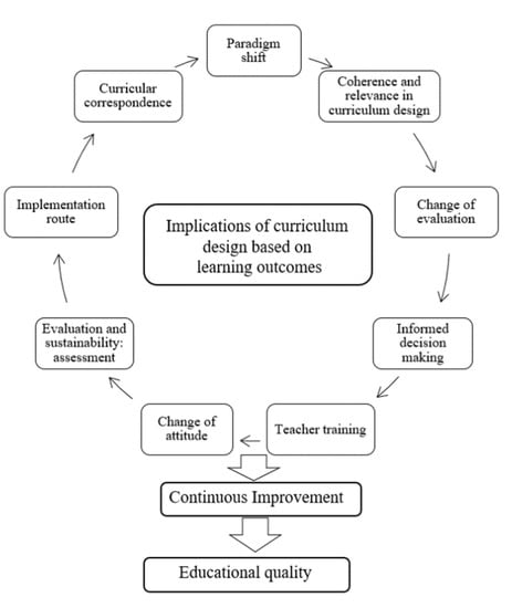 LO based on curriculum design has educational, pedagogical, and curricular implications and affects all those involved in these processes. The proposed approach aims at improving the quality of education and, for this purpose, must consider continuous improvement. Considering the above, the elements that should be in the design of the curriculum based on LO: the change of attitude of all the roles involved, the evaluation and sustainability of the assessment, the implementation route, the curricular correspondence, the shift in paradigm, the coherence and relevance of the curriculum design, the change in evaluation, informed decision making, and the training of professors. All of these elements are related from the perspective of LO-based curriculum design. These implications are in Figure 2.