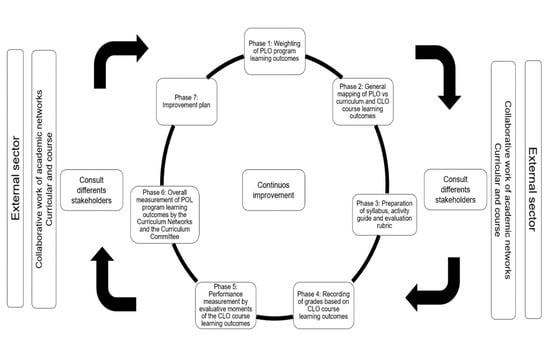 Phase 1 Weighing of PLO program learning outcomes; Phase 2 General Mapping of PLO vs. curriculum and CLO course learning outcomes; Phase 3 Preparation of syllabus, activity guide and evaluation rubric; Phase 4 Recording of grades based on CLO course learning outcome; Phase 5 Performance measurement by evaluative moments of the CLO course learning outcomes; Phase 6 Overall measurement of POL program learning outcomes by the curriculum networks and the curriculum activities; and Phase 7 Improvement plant. All these are framed in the continuous improvement of the program’s curriculum.
