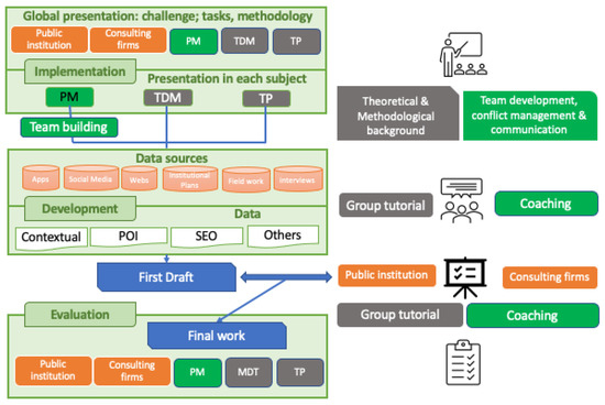 The multidisciplinary and multidimensional character of tourism [49] includes the interaction between tourists, local population, public administration, and tourism companies. Based on this, the LBD and coaching project included four types of actors that facilitated the learning process: (1) public institutions or local government, (2) tourism consulting firms, (3) university professors in charge of People Management (PM), Tourism Digital Marketing (TDM), and Tourism Policy (TP) subjects; and (4) students.