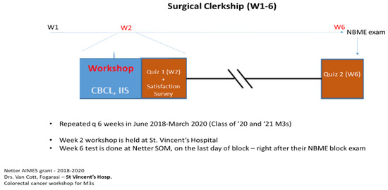 Workshop material was selected for this event to fit into a series of half-day learning sessions during Y3 Surgery clerkship at St. Vincent Medical Center, Bridgeport, CT, a major teaching affiliate of the Frank H. Netter MD School of Medicine. Topics were solicited from clinical teaching faculty by discussing perceived gaps in knowledge during prior classes moving through their surgical clerkship and sharing these with basic science colleagues who made considerable efforts to actually teach these topics in the year prior. During AY 2018/19 and 2019/20, unselected groups of M3s participated in this mandatory event on Week 2 of the clerkship, then answered a brief recall test four weeks later at the conclusion of the clerkship. (Figure 1). The program began with Block 3 in 2018 and the series was cut short slightly by the COVID-19 pandemic, cancelling clinical rotations in Spring 2020, but by that time, data on all but two groups of students were available.