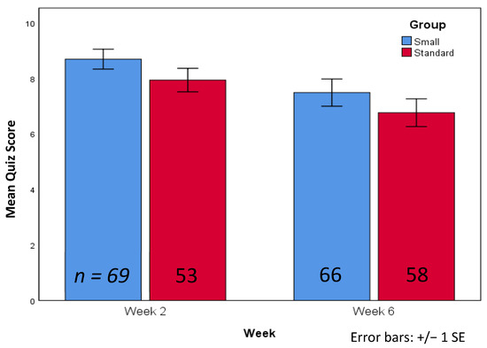 Learning quiz scores for small groups (in blue) and standard groups (in red) comparing week 2 (immediate recall) and week 6 (4-week retention). (n numbers represent the number of students surveyed).