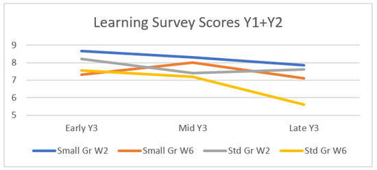 The form of instruction favored learning in small groups (Figure 3 and Table 2). Students in small groups (SG, blue bars) have done better overall, with a combined W2+6 test average of 7.83 points, whereas those in standard-sized groups (StdG, red bars) had averaged 7.2 (p = 0.007). Note, the SG vs. StdG overall performance (W2+6 combined) is reflected by the average of the values of the two blue bars or the two red bars in Figure 3.