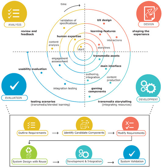 The current work elaborates on an interactive UX design methodology, assembling learning resources into a transmedia storytelling integration to supplement the teaching of classical or philological topics through hybrid or blended education. The main target set for the proposed framework is to be easily deployed and handled by educators with limited technological know-how and without possessing substantial software and/or multimedia developing skills. Therefore, to test the validity of the approach, it is vital to investigate the availability of appropriate resources and tools that can be productive during the authoring process, involving people with the above capacities. In this context, the CBSE model is considered the most applicable, combined with the human-centered LUCID implementation scheme, structured in the phases of analysis, design, development, and evaluation [1,2,3,4,5,27,28,29]. Figure 1 incorporates the above parameters into a spiral rapid prototyping layout to serve the raised challenges and needs. Specifically, the blueprinted configuration allows all the involved actors (teachers, students, technologists, and subject matter experts) to be part of this co-creation process, shaping novel collaborative ideas and best practices in transmedia learning organization and management.
