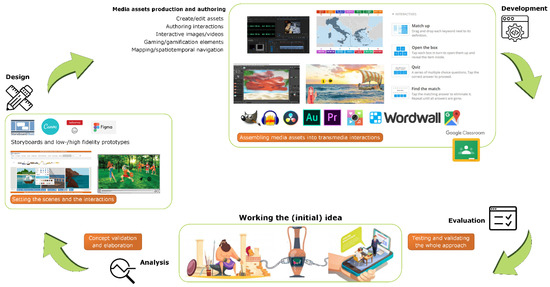 Elaborating on the obtained content and audience analysis insights, the next step was to investigate tools and resources that could handle the indicated media entities (text, image, audio, video, gaming or interactions, etc.). Overall, all of the stated multimedia types were considered most helpful for the current application needs, as long as the associated processing and authoring environments can be accessed and easily operated by educators exhibiting limited technological familiarity and developing skills. Therefore, the need for image, audio, and video creation and editing was initially emphasized, followed by tools for authoring audiovisual narrations, multimodal presentations, gaming interactions, and spatiotemporal or mapping navigation elements. Once baseline tools and platforms were found, they were more carefully investigated in the design phase while setting up a more detailed implementation plan, as presented in the following sub-section.