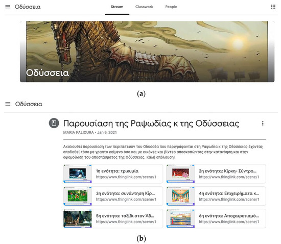 As already stated, multiple assets were created and organized to deploy a plurality of navigation paths, storylines, and interactions. Google Classroom has been selected as the starting point of the narration, i.e., the main interface for delivering all of the individual resources (Figure 3a,b). This approach aligns with the transmedia storytelling concept, integrating all individual media in a modular way. Hence, the formed Google Classroom can host all the crafted material, i.e., embed web and browsable content, share links and other useful pages, set “meeting rooms” and communication methods, etc. Therefore, users (teachers and students) can combine the different modalities (content types, interactive services, topics, etc.), mixing multiple learning modules in innumerous ways, thus making the most out of a modular assembly scheme. Alternatively, the offered educational components can be communicated and/or browsed directly through the implicated channels, according to the users’ preferences and/or their contextual situation (i.e., accessing time, place, device, purpose, etc.). Multimedia content and functionalities can also be updated in the associated implementation platforms when needed (with quick links’ refreshing being entirely adequate) or removed, if necessary (i.e., if they do not serve the learning aims anymore). Likewise, they can be transferred and updated to other environments that better face the set requirements (i.e., if fresh tools have appeared, expanded, or altered their use and licensing status). In this perspective, Google Classroom can also be substituted by a different site (LMS program, webpage, etc.), which would become the new starting point of the story. Therefore, services can be easily updated if this is dictated by changes in intellectual properties, personal data regulations, or users’ rights policies, or when the market urges the immigration to a different technology or communication medium. The Adobe Flash paradigm, already discussed in a previous section, is an excellent example of experiencing how such changes can affect procedures, putting aside some old work and quitting past efforts. For instance, multitudes of educational applications developed in Flash and delivered as SWF (/’swif/) files have become obsolete since they can no longer be normally distributed through the web.