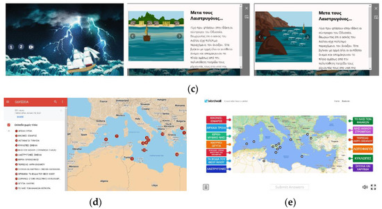 In the present status of the environment, as depicted in Figure 3b, six main sections of the “Odyssey” have been organized. They highlight the sea storm adventure, the meeting of Circe with Odysseus’ companions and Odysseus himself, her effort to convince Odysseus to stay on the island, the trip to Hades seeking advice from the prophet Tiresias, the farewell, and the beginning of the return journey. These interactive presentations have been implemented in Thinglink (Figure 3b,c), encompassing text, image galleries, voice-over, and embedded YouTube video links to enhance the narrative experience by covering multiple learning requirements. Hence, audio and video material augment directness and vividness with text representing clearer and firmer descriptions that can also initiate literature exercises. Apparently, the choices for this content are limitless (i.e., different combinations of modalities can be set), with additional pieces easily crafted and incorporated into the storyline, depending on the educational needs and focus of the associated teachers. Such links can also be part of story maps (Figure 3d) that geographically depict the implicated events, involving similar media representations (i.e., text, images, audiovisual streams, etc.). These location-driven storytelling services can be easily set on Google Maps (or other related utilities), while they can also be combined with simple games that can be quickly crafted in relevant online environments like Wordwall (Figure 3e).