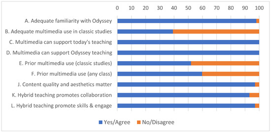 Figure 4 and Figure 5 represent the findings produced by the analysis survey. It is essential to notice that most participants were familiarized with the epos of the “Odyssey” (98%), sharing similar concerns with the ones already analyzed for both viewpoints of teachers and students, thus validating the whole approach (and their selection in this experimental process). More specifically, the vast majority agreed that multimedia is inadequately used in classical studies (>60%), though they seem to have the potential to support the “Odyssey” in broadening today’s teaching (100%). Moreover, a considerably high percentage claimed to have such previous experience of technology-assisted learning in classical studies (52%) and, generally, in any class (60%), indicating a good balance of the samples in that perspective. High scores were also received for the significance of the content quality and the aesthetics of the anticipated narrations (97%), with most subjects agreeing the targeted hybrid teaching promotes collaboration (93%) while cultivating more skills and engaging students to seek additional knowledge (97%).