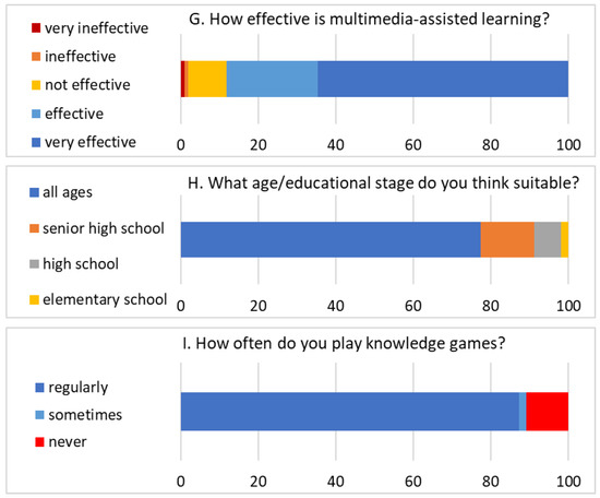 Figure 5 provides more profound insights, indicating that multimedia-assisted learning is expected to be “effective” (23.5%) and “very effective” (64.7%). Small percentages were counted for the votes “not effective” (9.80%), “ineffective” (0.98%), and “very ineffective” (0.98%), with the last two tiny estimates implying a negative impact (i.e., multimedia would have worsened learning outcomes). Furthermore, participants agreed that the proposed hybrid teaching approach would be appropriate to all ages and educational stages (77.45%), with smaller groups expressing their preferences in senior high school (13.73%), high school (6.86%), and elementary school (1.96%) levels. Finally, most subjects voted that they play knowledge games regularly (87.25%) or sometimes (1.96%), with the remaining minority (10.78%) stating that they never had such an edutaining experience. It can be justified that the audience analysis results confirmed the initial expectations, validating once again the soundness of the approach.
