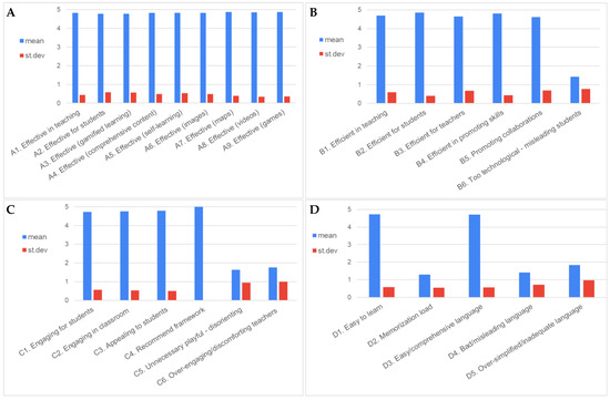 The final task of the experts’ group was to help prepare the questionnaire for the quantitative summative assessment. A multi-parameter approach was adopted to measure the usability criteria and the educational impact of the delivered storytelling services (Table 3). As already explained, the utilized factors elaborated on the Five Es of usability and the Nielsen metrics. Specifically, four (4) distinct categories (A, B, C, D) were formed to evaluate effectiveness (A), efficiency (B), engagement (C), and learnability—simplicity (D). Effectiveness refers to the level of completeness and accuracy in that the desired goal is achieved using the interface at hand (how satisfactory the learning outcomes are in the current case). Efficiency is coupled with the productivity of the application, i.e., the time needed to achieve the set goals (how quickly educational earnings are obtained). Engagement accounts for the degree of pleasantness and satisfaction offered to the users to draw their interest and spur enjoyable interactions (the appeal of the educational resources to engage students in the learning process). Learnability shows how easily the interface can be operated without prior experience and the need to memorize interactions (how quickly someone can comprehend the succession of the educational nodes to access the offered knowledge). It often depends on the simplicity that diminishes overhead, facilitating easy navigation (simple options and data can expedite the learning process). Figure 6 presents statistical values (mean-standard deviation) of all the categorized assessment variables, with Figure 7 summarizing the results in a radar diagram with the formed categories.