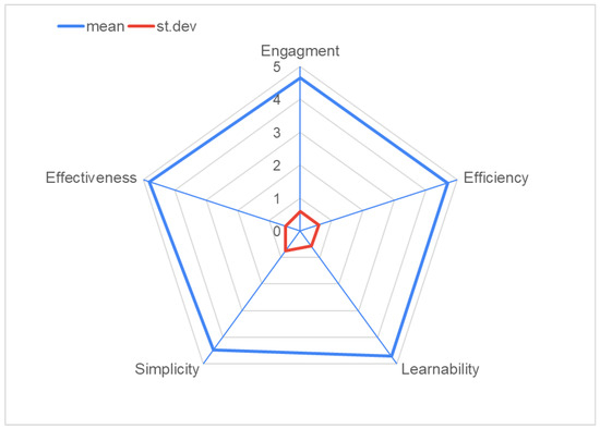 A synopsis of the assessment outcomes is depicted in Figure 7, representing how the usability measures (and their educational orientation) are arranged across the main axes of efficiency, effectiveness, engagement, learnability and simplicity within a radar plot. The curves (mean, standards deviation) have been calculated using the entire population of the associated categorized parameters (presented above) after reversing the order of the negatively phrased questions. A second approach was also tested, extracting the statistic values only by the positively oriented variables (i.e., excluding B6, C5, C6, D2, D4, D5), with the result being almost identical (so, the greater population of samples was preferred). Accordingly, the global metric estimations were obtained using the following observations: effectiveness (A1-A9: 4.83 ± 0.46), efficiency (B1-B6: 4.70 ± 0.60), engagement (C1-C6: 4.65 ± 0.59), learnability (D1-D2: 4.72 ± 0.57), and simplicity (D3-D5: 4.49 ± 0.75). The results are very similar to the ones presented for each of the four groups (Figure 6), with a slight differentiation in the engagement and simplicity axes. As previously commented, this was already detected as an outlying effect for queries stated in reverse scaling (i.e., B6, C5, C6, D2, D4, and D5), especially those associated with simple content or language and engaging dynamics. The reason behind these particularities is that the specific features are both positively and negatively attributed, as explained below.