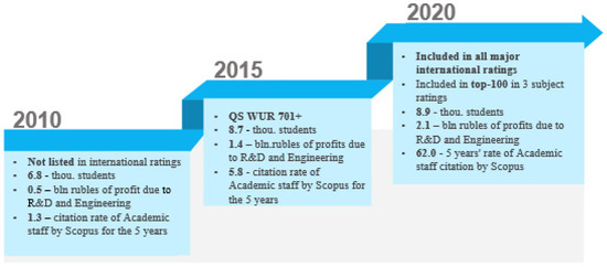 NUST MISiS is used as an experimental basis for the research. NUST MISiS has transformed from the industry-based institution of higher education not listed on global ratings into the international research university included in top-500 of the institutional global QS rating and top-100 of QS subject ratings and ARWU over the past 10 years (Figure 1).