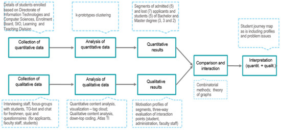 The next stage of the University development within the transformed environment pre-determined the need to develop the conceptual digital transformation model of the University to achieve the strategic goals and generate the ecosystem that can contribute to such achievements. A special research was performed to justify and generate the model. The research was carried out according to the mixed methods approach (Figure 2), sub-type: triangulation, convergence model. The choice of the research design is determined by specific features of the data collected by the University as well as by the goal which is data-based decision making aimed to improve students collaboration experience with a particular university (single phenomenon).
