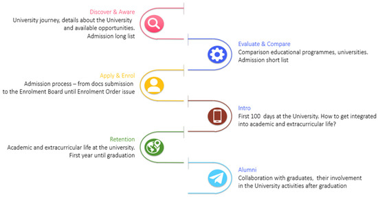 This system is supplemented with Omni channel communications and virtual assistants that make it possible to completely robotize all the routine business processes of NUST MISiS. Moreover, conditions will be provided to form a sustainable growth of the university’s lifetime value for a person throughout the entire life cycle of the latter (Figure 6).