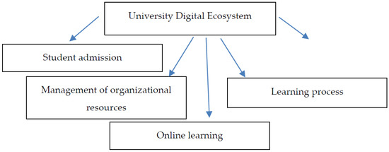 Digital revolution, pandemic, globalization and global economy multiple headwinds have resulted in the fact that the existing models of higher education, deemed as achievements of the second half of the 20th century, are currently losing their efficiency [6]. Just as globalization and technology have affected other huge sectors of the economy over the past 20 years, universities will face the need for fundamental changes in the coming 20 years [7,8]. Universities are challenged by digital transformation: profound re-engineering of business processes implying application of a wide range of digital technologies, and development of new educational process models [9,10,11]. The University digital transformation processes are focused on shifting from formal teaching models to informal models, including through the innovation design of the educational process based on state-of-the-art technological and teaching solutions aimed at education efficiency enhancement, considering the changing demands of the HR market and the vital need to obtain competing advantages in attracting and retaining the students [12,13,14]. The COVID-19 pandemic period gave rise to a set of models for digital education transformation [15,16,17]. We think that the task of the university digital transformation is to smoothly and comfortably apply breakthrough technologies to give rise and boost advanced innovations in education [18,19,20]. It requires not only digitalization of the current processes by partial immersion into the virtual educational environment; it requires complete transformation through development of the University digital ecosystem [21]. The theoretical and methodological basis for the ecosystem development lies in the synthesis of theoretical concepts in the ecosystem economics and indicative coordination and values control, participatory culture of the organization theory, Kolb’s cycle in teaching adults [22]. Moreover, requirements of the present-day employers and standards of education are considered. The environment transformation dynamics determines the need for business units self-organization and self-regulation that, in fact, contributes to the transformation of the units themselves. G.B. Kleiner [6] specifies various social and economic ecosystems as key factors in the future economy. The fundamental relations between the ecosystem components is based not on material and information flows exchange, but on the transfer of rights of access to the existential resources of space and time, as well as rights of access to energy resources—activity and intensity. Management of such conglomerates must be based on soft management principles. While the role of the state must be limited to the indicative coordination and values control. The ecosystem creates the environment which makes it possible for all subjects including students to be able to accept and get adapted to a wide range of new technologies (including, digital skills development) [23], to form and show pro-active behavior both in learning, research and development and professional activities [24].